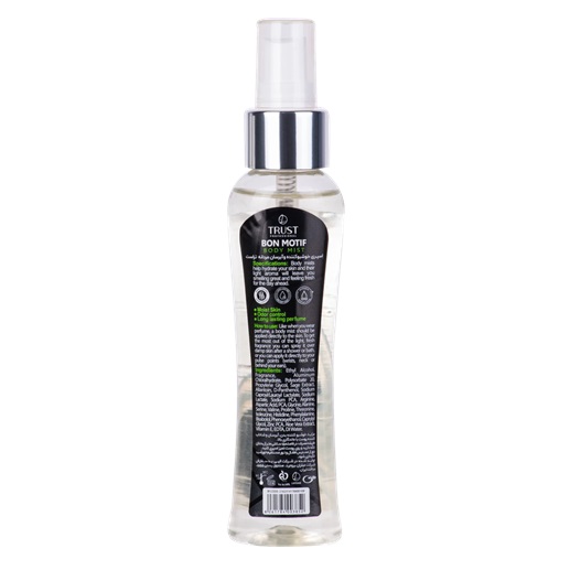 بادی میست مردانه تراست Bon Motif با حجم 100 میل و رایحهای میوهای و خنک به شما ارائه میشود. نتهای اولیه آن شامل ترکیبی تازه از آناناس، انگور سیاه و سیب سبز است و با هم طوری ترکیب شدهاند که حس خنک و میوهای را برای شما ایجاد میکنند.